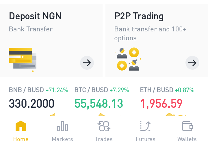 Open the Binance App. Click “P2P Trading” at the top menu on the app homepage.