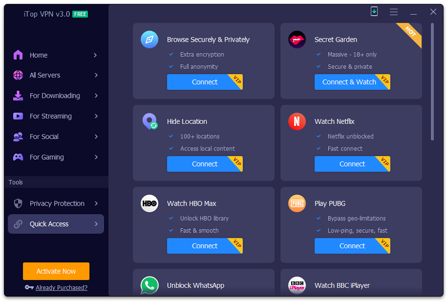 Quick Accessfeature: iTop VPN instructs users to quickly find the service they need for different server usage scenarios.
