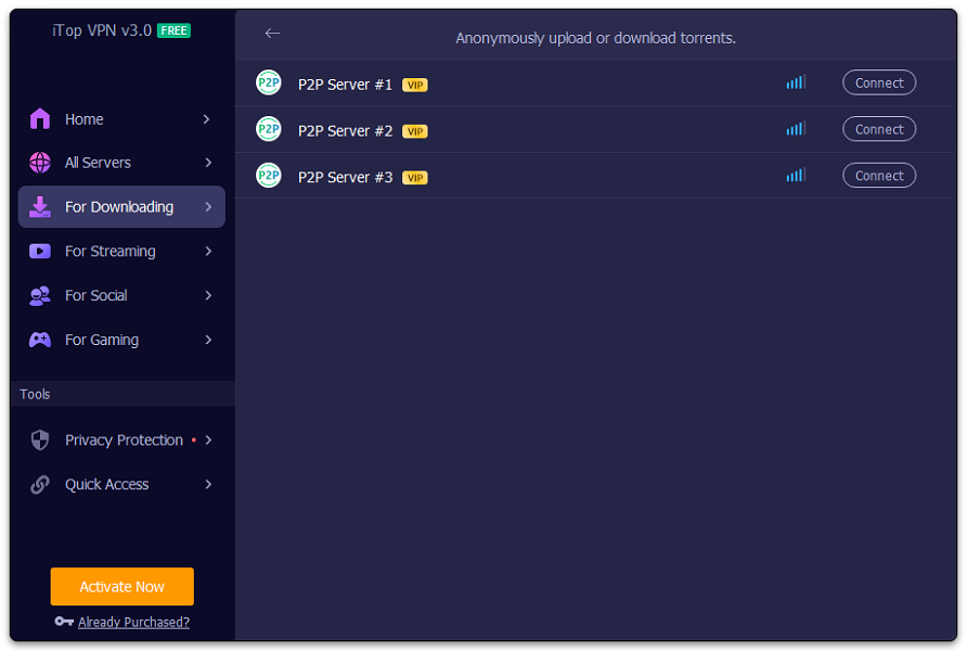 P2P and Torrenting: iTop VPN has fast and safe P2P servers to anonymously upload and download torrents.