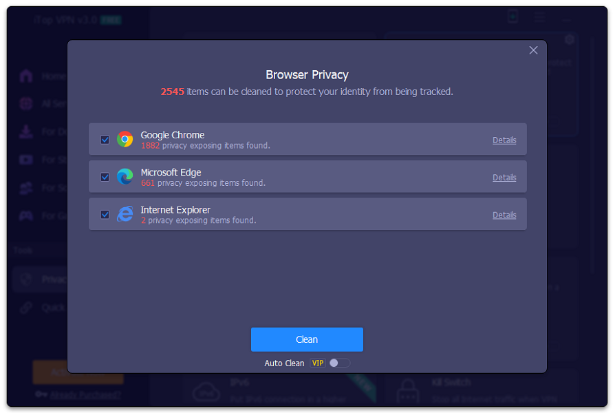 Private Browsing: iTop VPN auto scans and cleans privacy issues to protect theprivate data from being tracked.