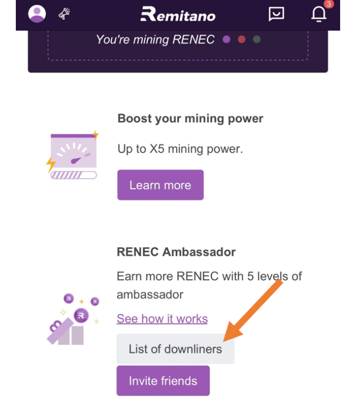 To remind your downliners to complete the KYC Level 2 verification, you can use the KYC prompt button in the downline list section at Mining RENEC page.