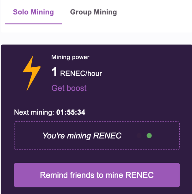 - If you are already in a RENEC mining session, the reward power will be applied in the next mining session when you return to mine.
