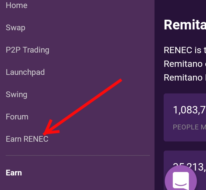 Step 4: Click on the drop-down menu at the top left corner of the app, and click on the "Earn RENEC".