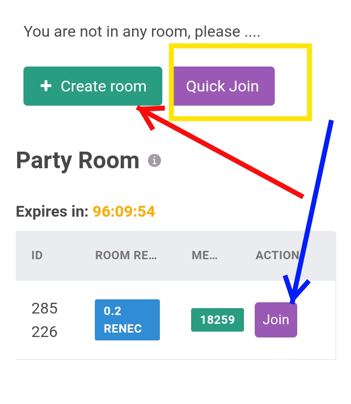 - You can also create your own RENEC party mining room by clicking on " Create room" as indicated by the "Red arrow" below:
