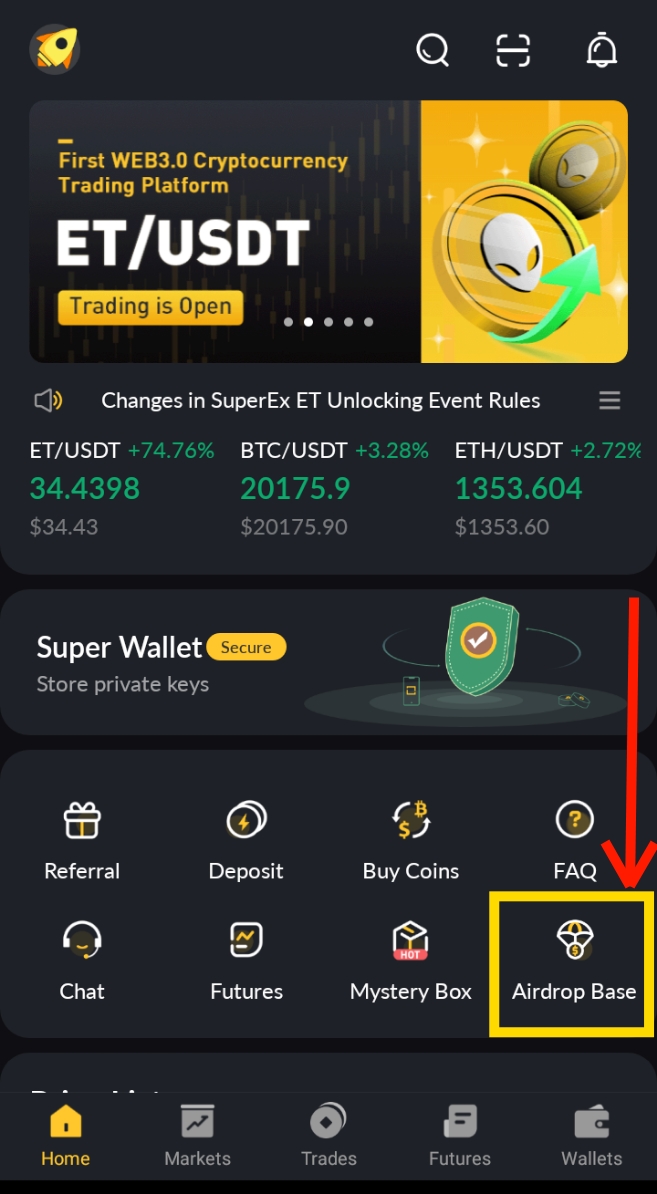 You can also unlock more ET token by by clicking on Airdrop base from the home page of the SuperEx APp. See screenshot below: