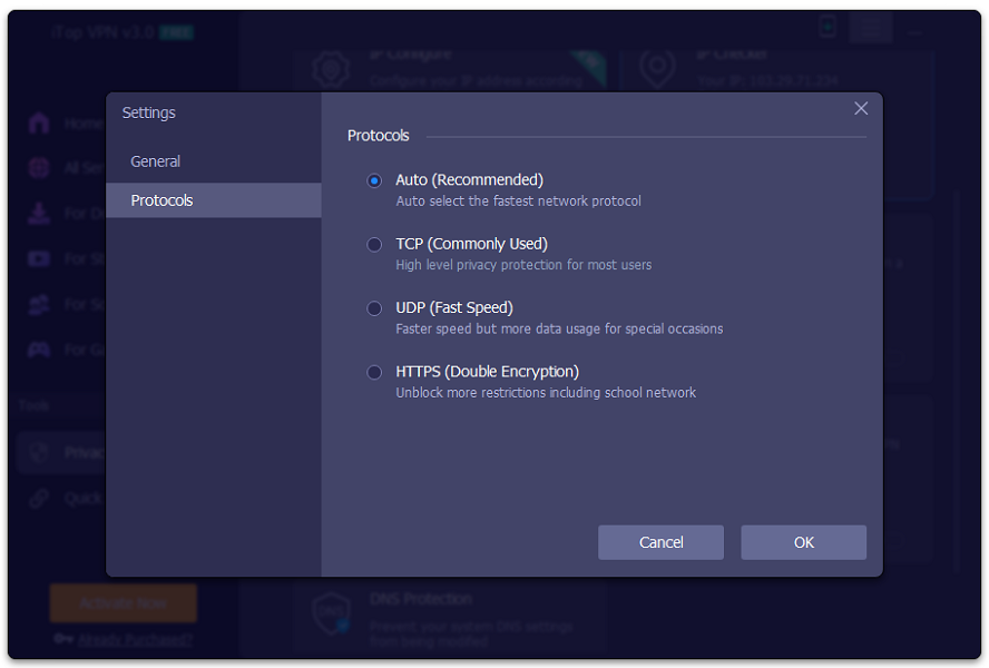 iTop VPN provides over 1800 global network servers for the specific use of Downloading, Streaming, Social, or Gaming. Furthermore, it offers TCP, UDP, HTTPS connection protocols for different purposes. Meanwhile, iTop VPN provides 10 useful tools for a higher security level. It defends against DNS attacks, auto cleans browsing privacy, disables the Internet connection with Kill Switch, allows you to configure your IP as static or dynamic with IP configure, and provides an IP checker tool for free.