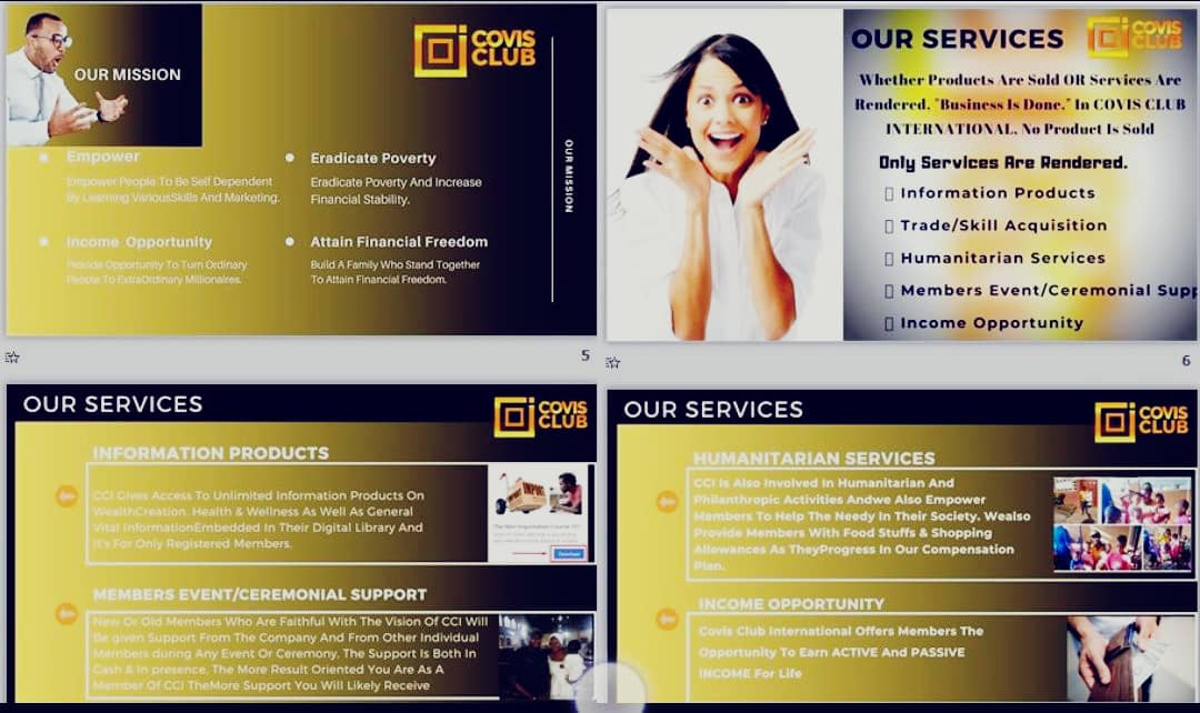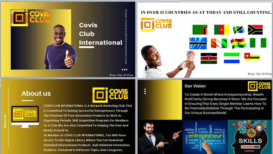 COVIS CLUB INTERNATIONAL is a network marketing club that is committed to raising successful entrepreneurs through the provision of free information products as well as organizing periodic skill acquisition programs for members. As a club, we are also committed to helping the poor and needy around us.