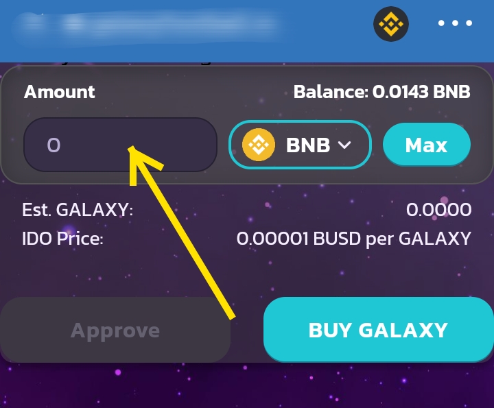After your Metamask wallet has been connected. Enter the amount of Bnb you want to use to buy the GALAXY token, and click on "BUY GALAXY".