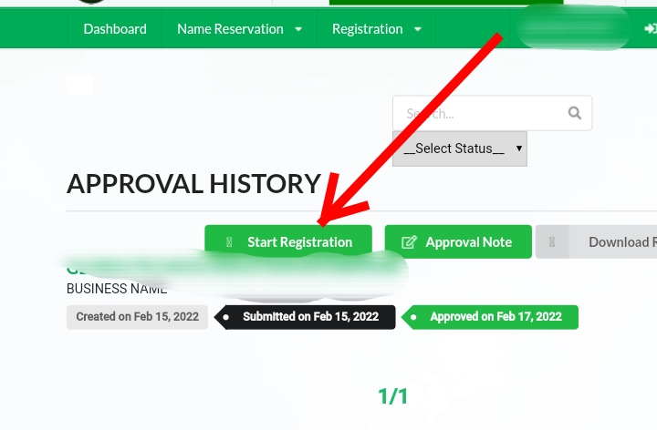 - The next step is to click on "start registration" beside your approved name and start registration.