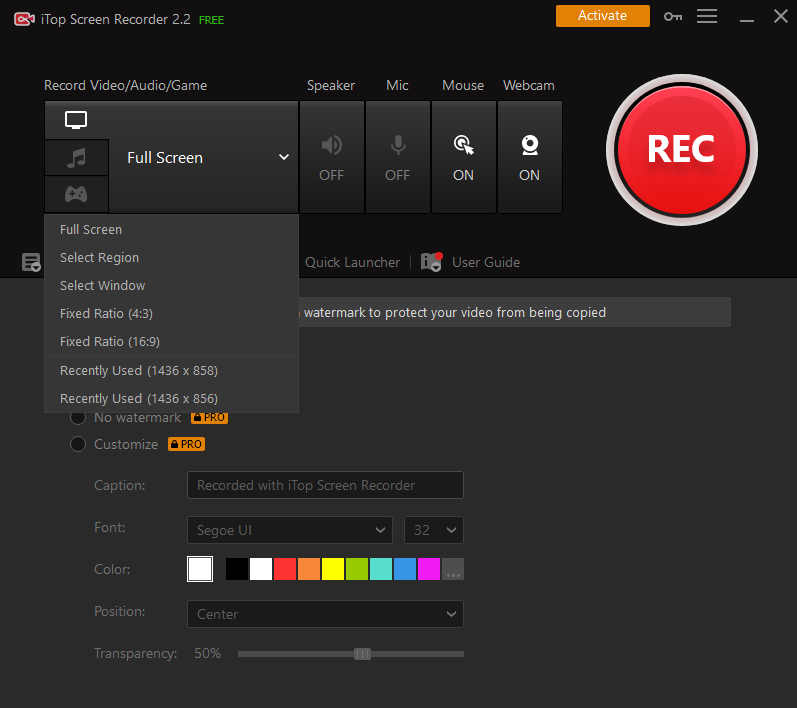 You can record without a watermark by unticking No Watermark in Settings. To protect your videos from being copied, it also allows you to customize your exclusive watermark with your customized characters, fonts, colors and sizes.